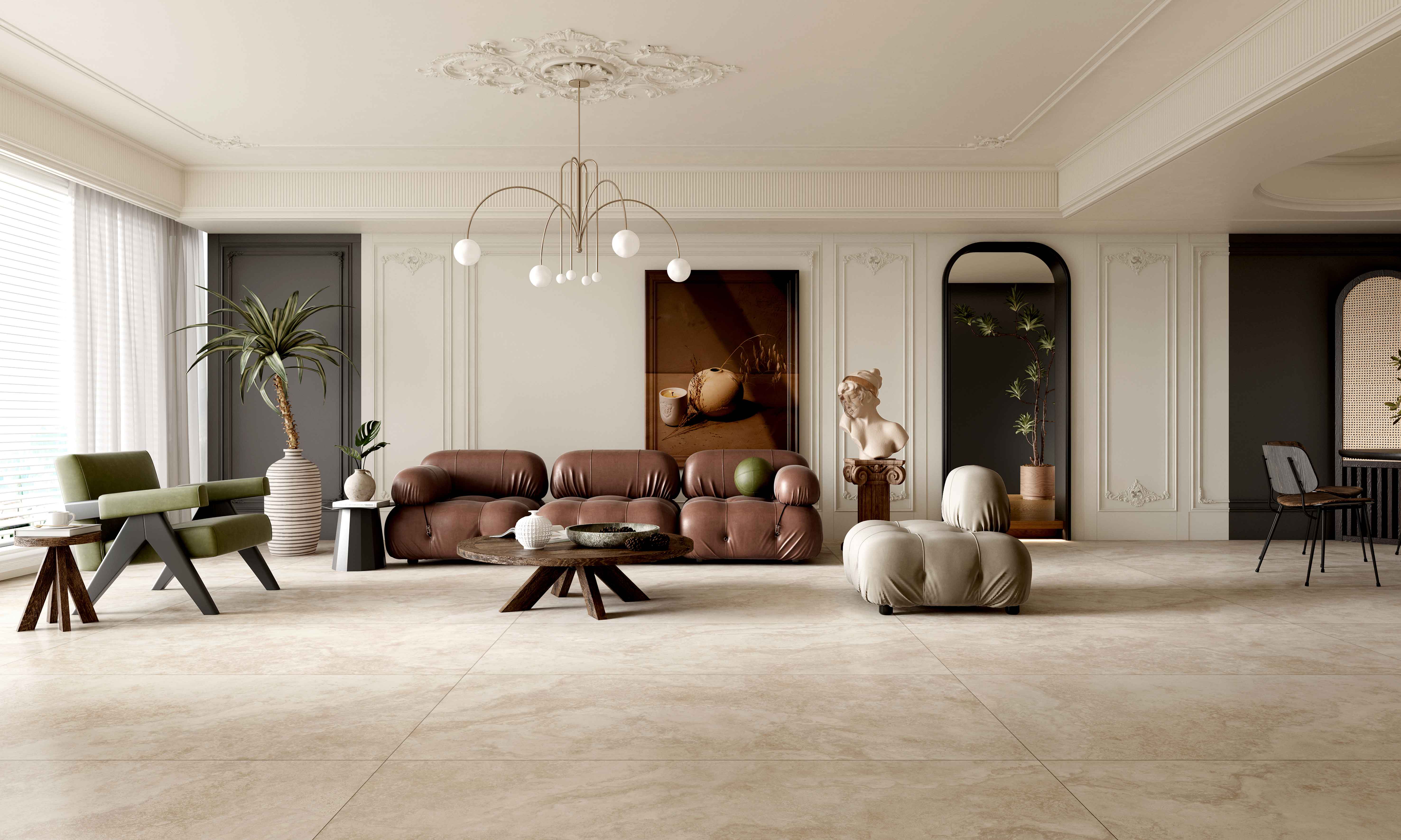 適用風格:該產品為子母配套磚,包含規格1200*1200mm/900*1800mm/750*1500mm;適用于現代簡約、奶油風、輕奢、新中式風格等